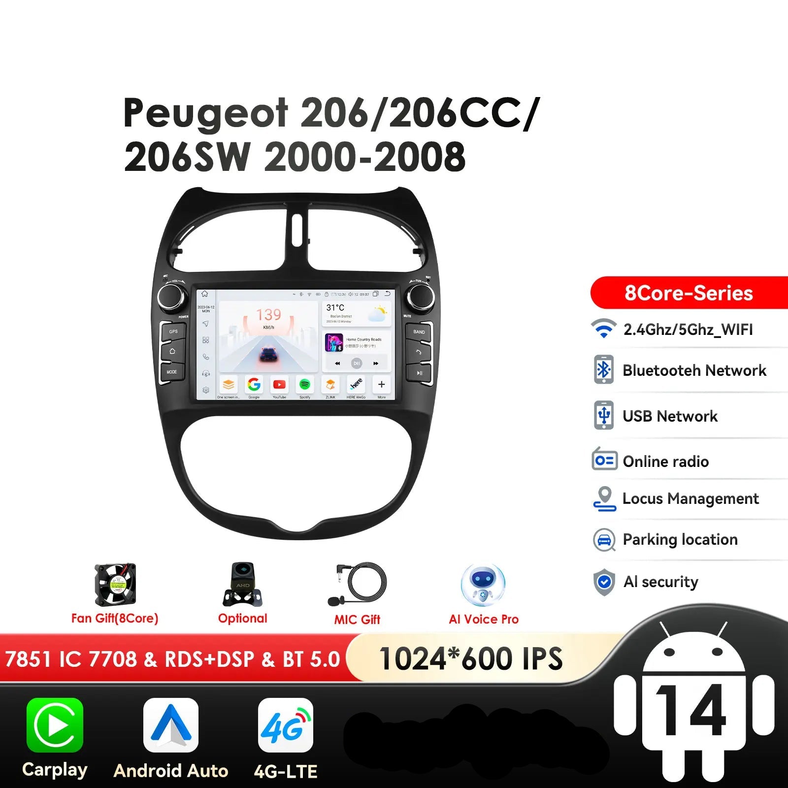 Peugeot 206 206CC 206SW 2000-2008 9" Android 14 Carplay Android auto wireless wifi bt gps 4g AUTM9GQB