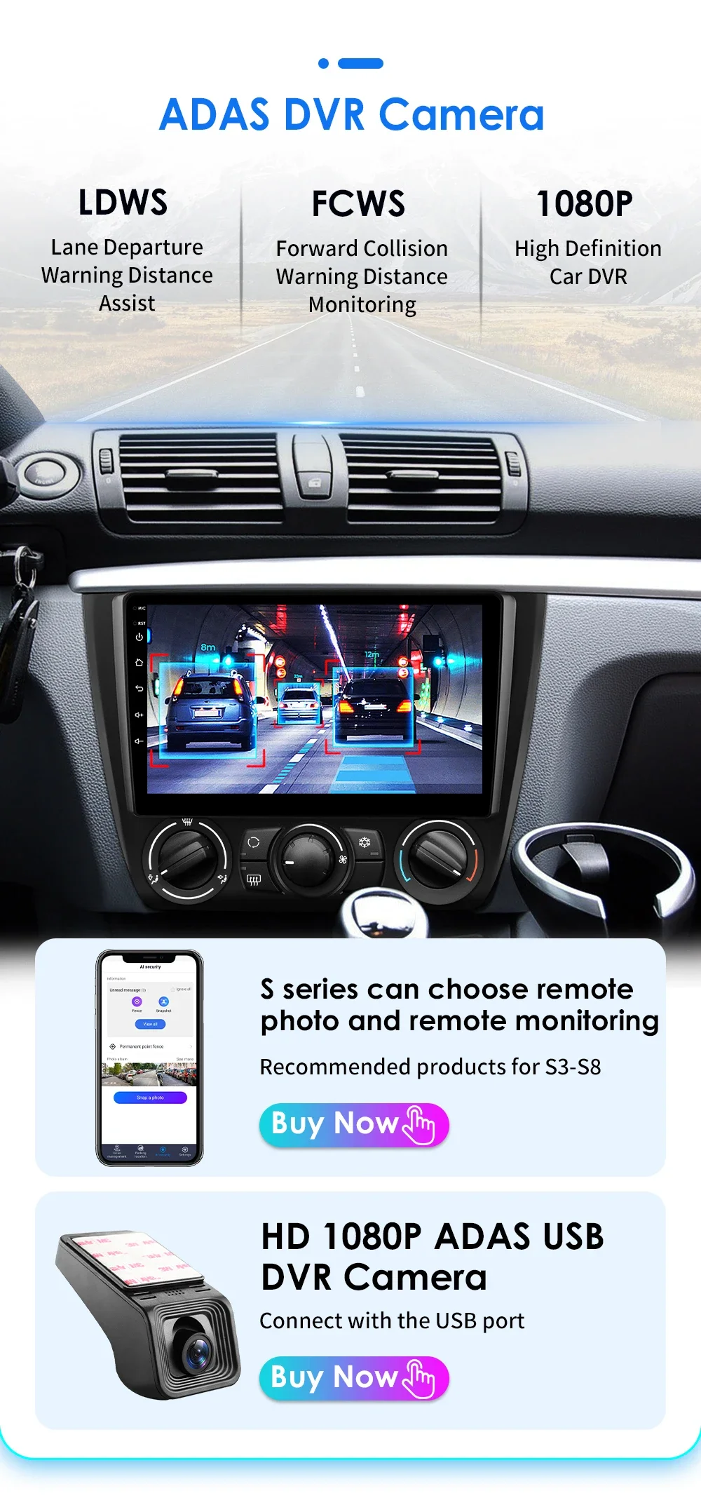 Telecamera DVR ADAS HD 1080P (da ordinare separatamente) -- collega alla porta USB: LDWS (Lane Departure Warning Distance), FCWS (Forward Collision Warning Distance), 1080P (High Definition Car DVR).