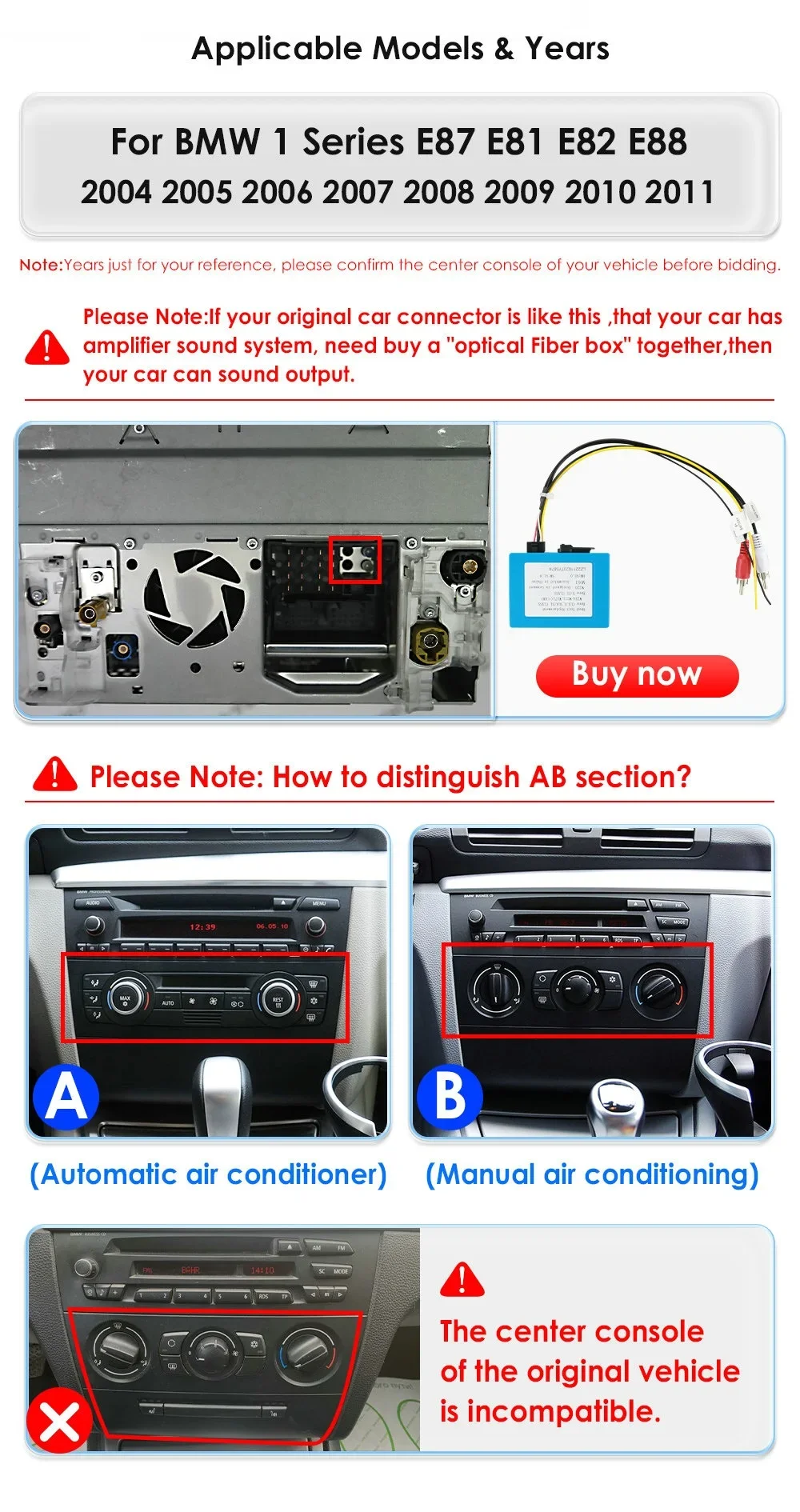 BMW 1 Series E81 E82 E87 E88 2004-2011 9" Android 14 Carplay Android auto wireless wifi bt gps 4g AUTM9KFA