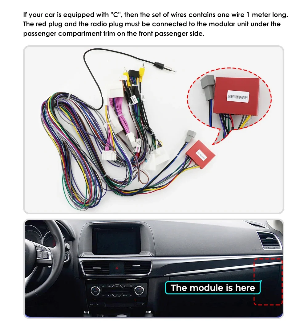 Il connettore rosso e il connettore della radio devono essere collegati al modulo situato sotto il rivestimento del vano passeggero, lato passeggero anteriore.