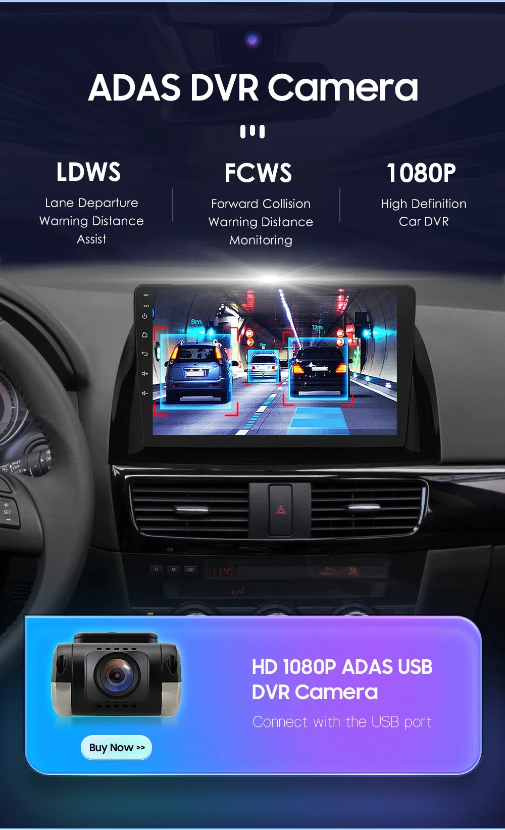 Telecamera DVR ADAS HD 1080P (da ordinare separatamente) -- collega alla porta USB: LDWS (Lane Departure Warning Distance), FCWS (Forward Collision Warning Distance), 1080P (High Definition Car DVR).