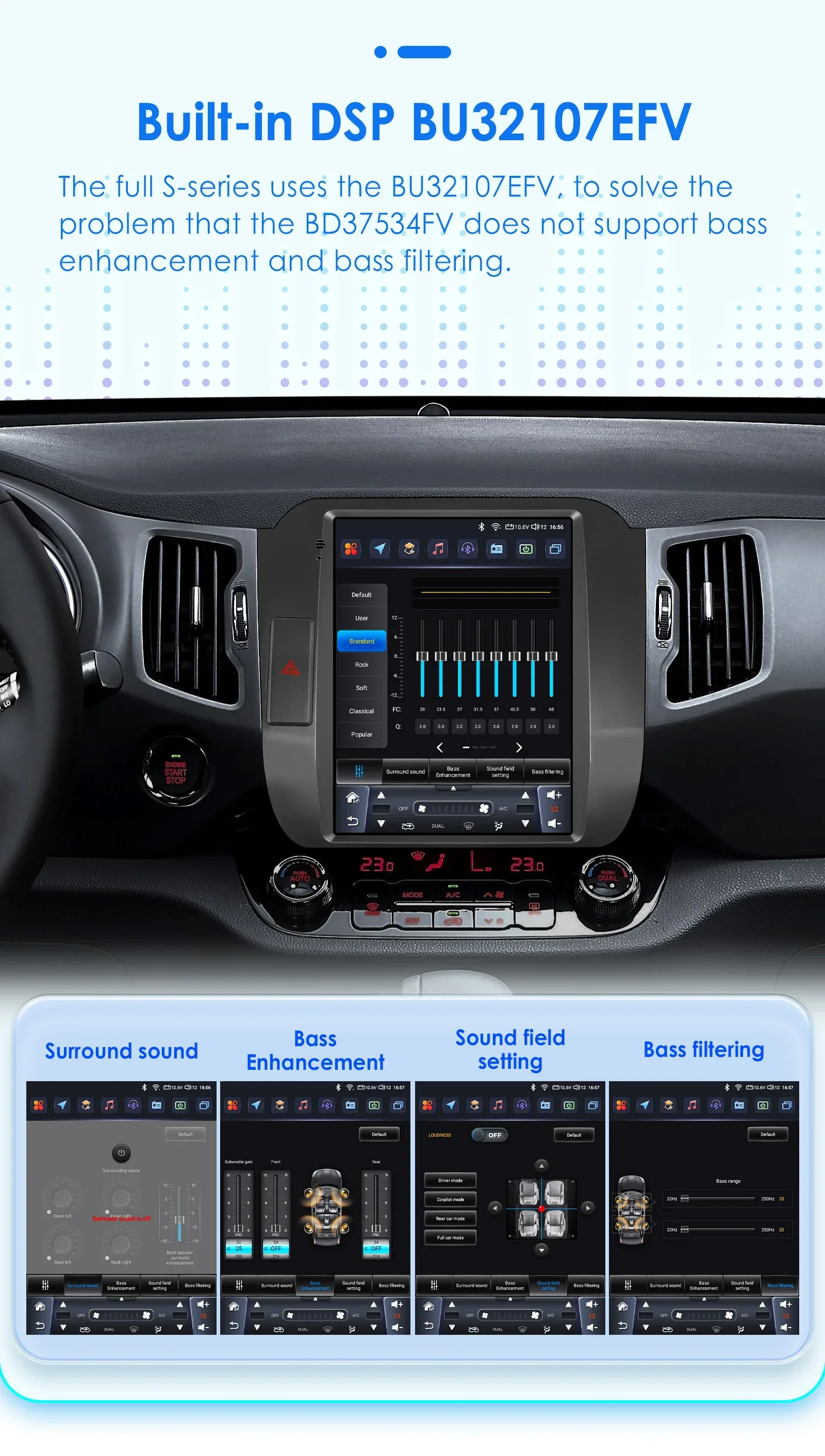 Built-in DSP BU32107EFV: We use BU32107EFV and BD37534FV DSP IC in different configurations products. The specifit difference please refer to the product configurations table.