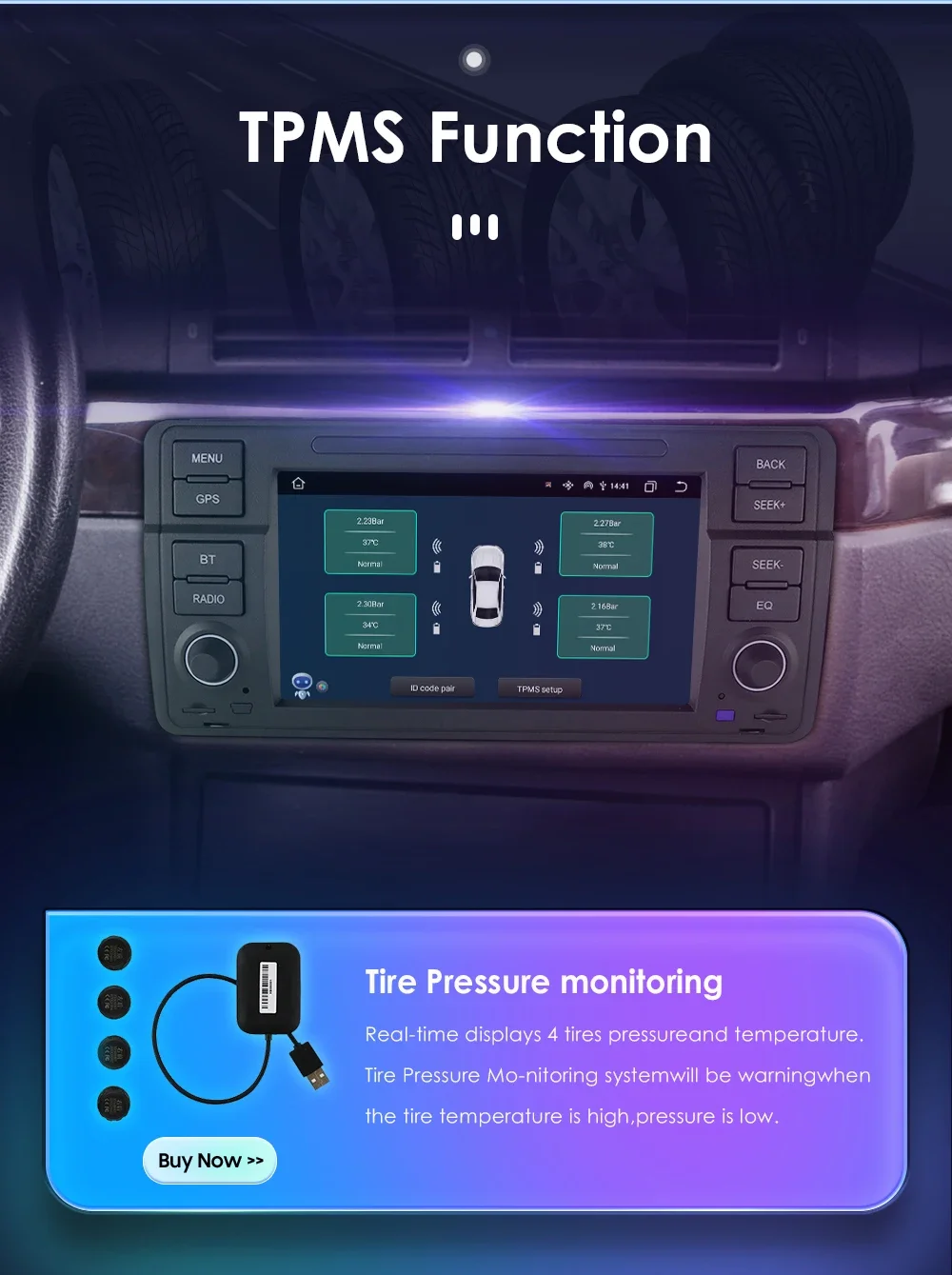 Tire Pressure Monitoring: Real-time displays 4 tires pressure and temperature,Tire Pressure Monitoring system will be warning when the tire temperature is high, pressure is low.
