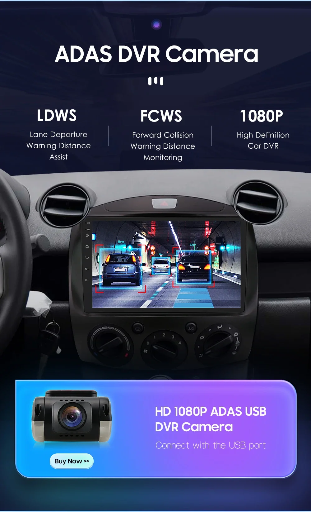 Telecamera DVR ADAS HD 1080P (da ordinare separatamente) -- collega alla porta USB: LDWS (Lane Departure Warning Distance), FCWS (Forward Collision Warning Distance), 1080P (High Definition Car DVR).