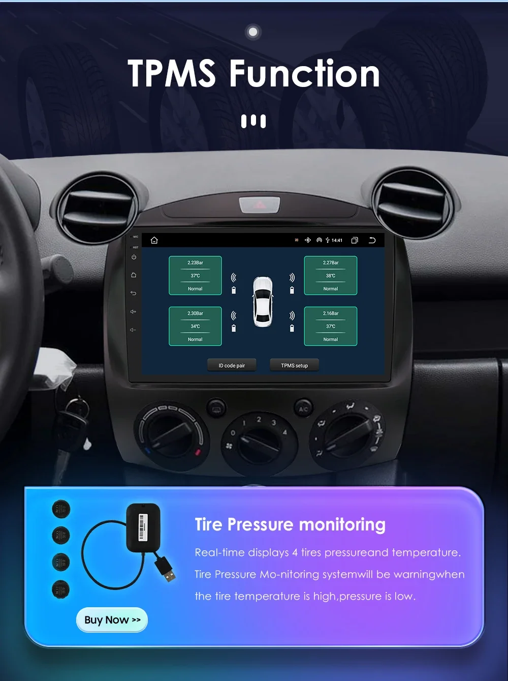 Funzione TPMS (da ordinare separatamente): monitoraggio della pressione dei pneumatici: visualizza in tempo reale la pressione e la temperatura di 4 pneumatici, il sistema di monitoraggio della pressione dei pneumatici avvisa quando la temperatura dei pneumatici è alta o la pressione è bassa.