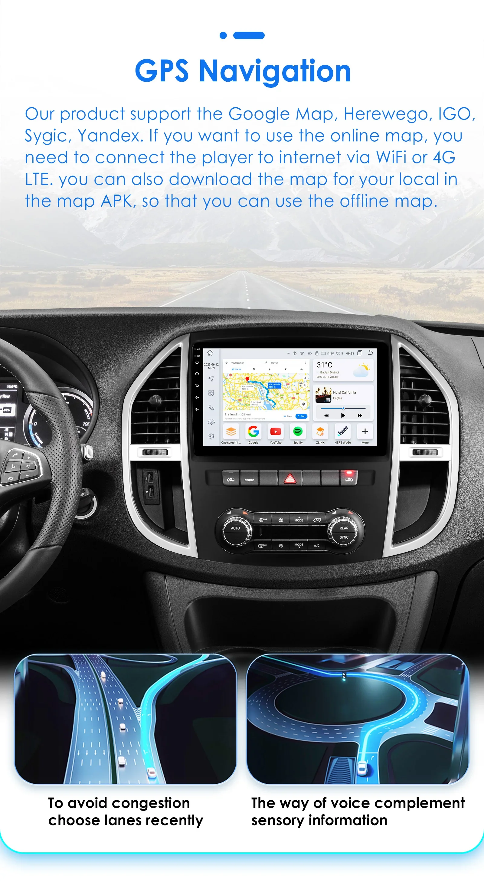 Piccola ventola di raffreddamento: Nota: la serie S 8Core è completamente inclusa. Gli articoli 4Core non includono la ventola e non supportano questa funzione. Navigazione GPS: supporta Google Maps online e offline, Navitel, Waze, Herewego Per evitare la congestione, scegli le corsie di recente, il modo in cui la voce completa le informazioni sensoriali. Supporta AV-OUT: scatola AV OUT (da ordinare separatamente) La serie S supporta 3 connessioni USB: memoria esterna: porta USB fino a 2 TB, questa unità può riprodurre file video e audio dal dispositivo esterno. Schermo diviso: puoi usare 2 app contemporaneamente (come: navigazione + musica, telecamera ADAS + musica, ecc.)
