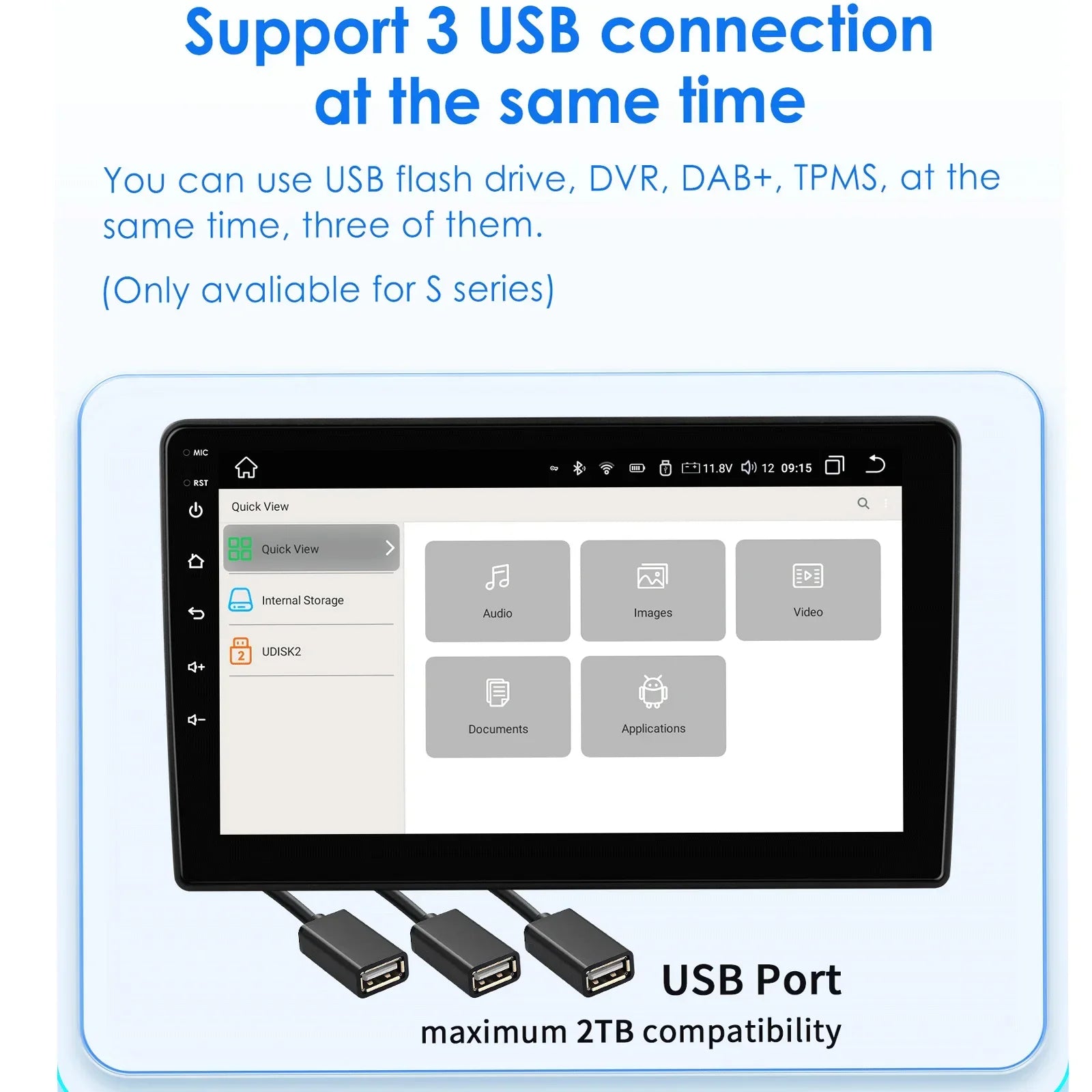 DAB+ Box (da ordinare separatamente): questa radio è dotata di un'APP per il lettore DAB, basta collegarla a un DAB+BOX tramite porta USB per utilizzare la funzione DAB+, supporta l'ingresso di programmi radio digitali e il funzionamento touch. È possibile utilizzare il touch screen dell'unità per cercare e cambiare programma e questa unità può alimentare il DAB+BOX collegato.