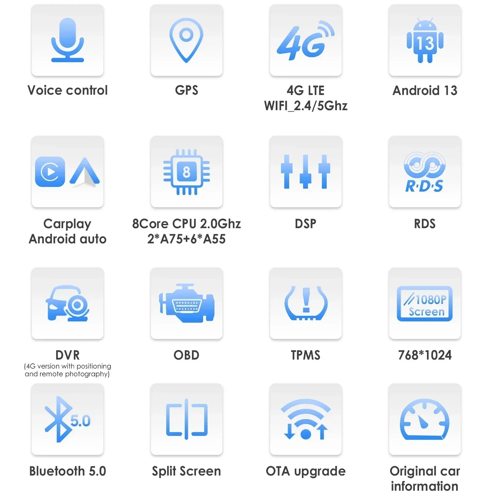 Support Carplay / Android auto: Phone / Music / Maps / Podcasts Make your journey easier and more fun. support wireless carplay,wired android auto,wireless android auto(which needs to set its cell phone wifi hotspot's AP Band as 5 Ghz band).