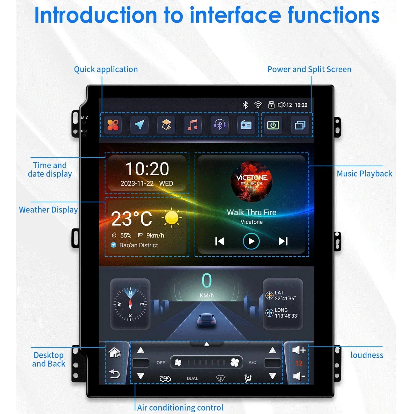 applicazione rapida, accensione e schermo diviso, visualizzazione di ora e data, riproduzione musicale, visualizzazione meteo, desktop e retro, controllo dell'aria condizionata,