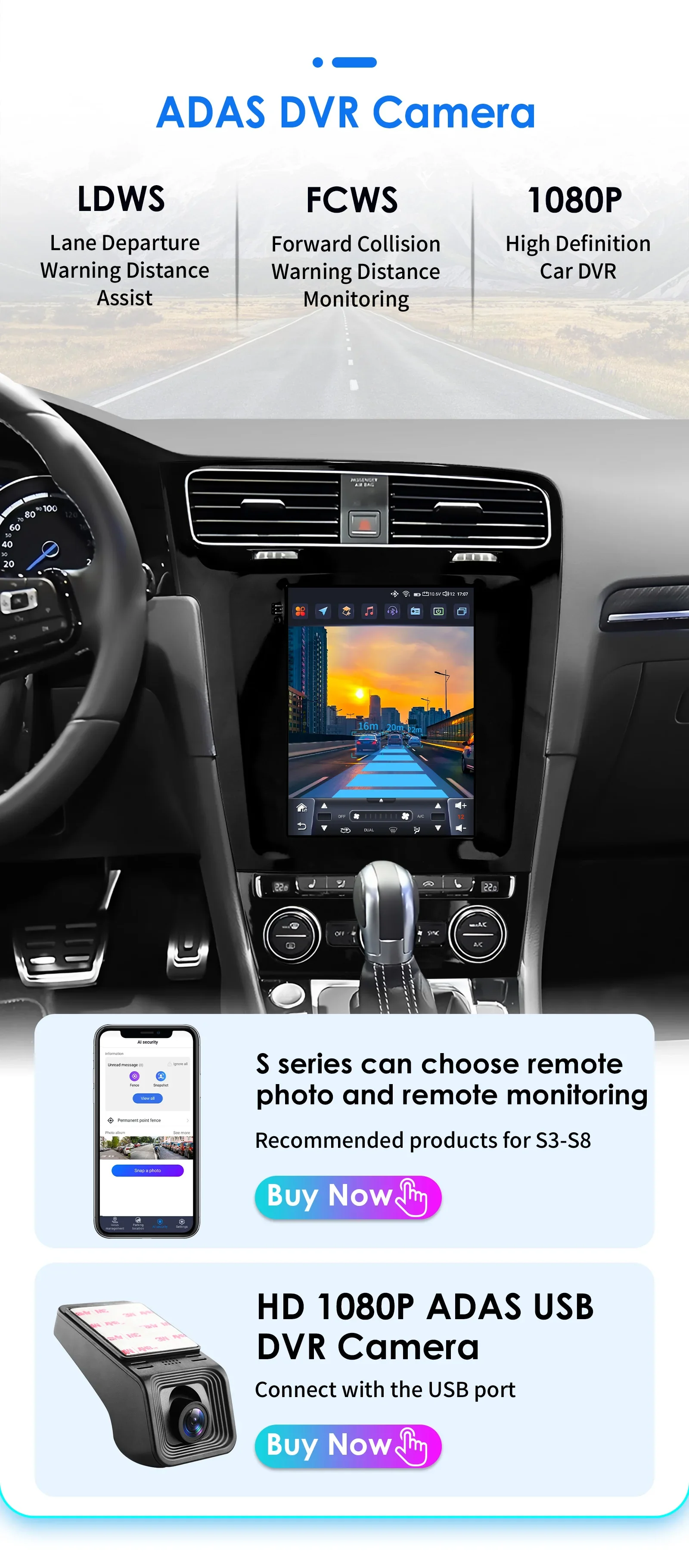 Telecamera DVR ADAS HD 1080P (da ordinare separatamente): da collegare alla porta USB: LDWS (Lane Departure Warning Distance), FCWS (Forward Collision Warning Distance), 1080P (High Definition Car DVR).
