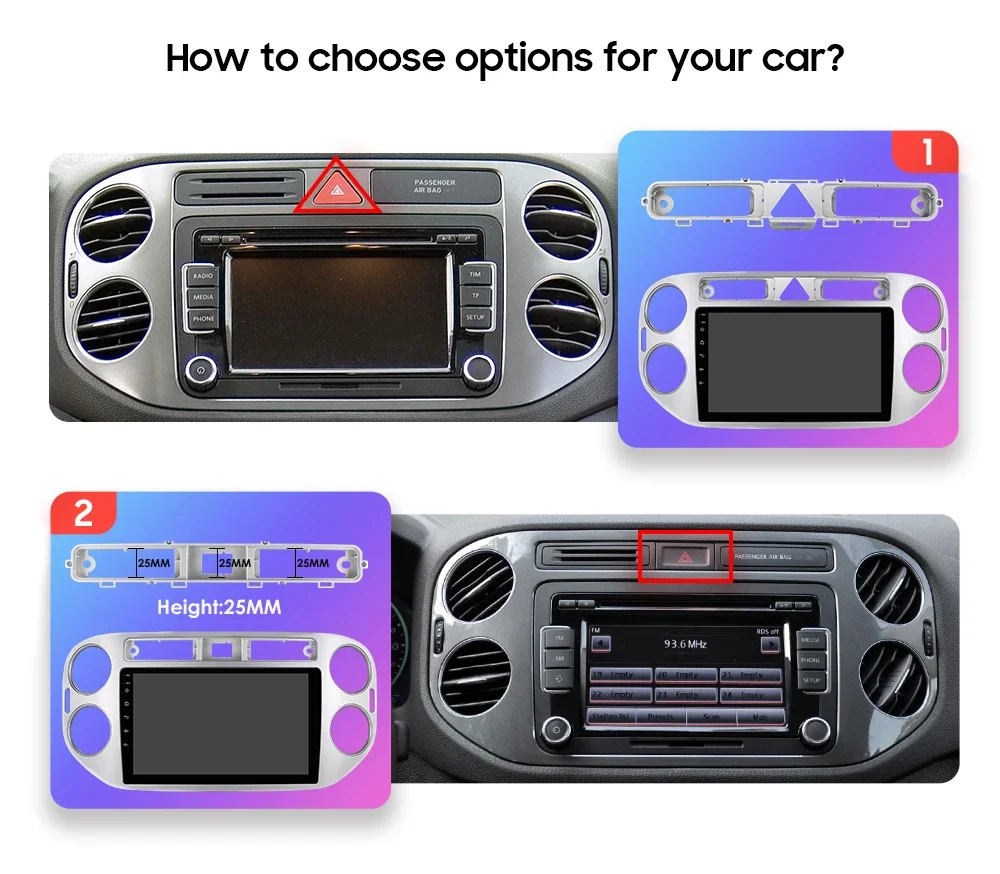 Se la tua auto ha il pulsante delle emergenze (hazard) nella parte sopra le bocchette dell’aria, allora scegli la cornice Opzione 2 (altezza 25 mm).