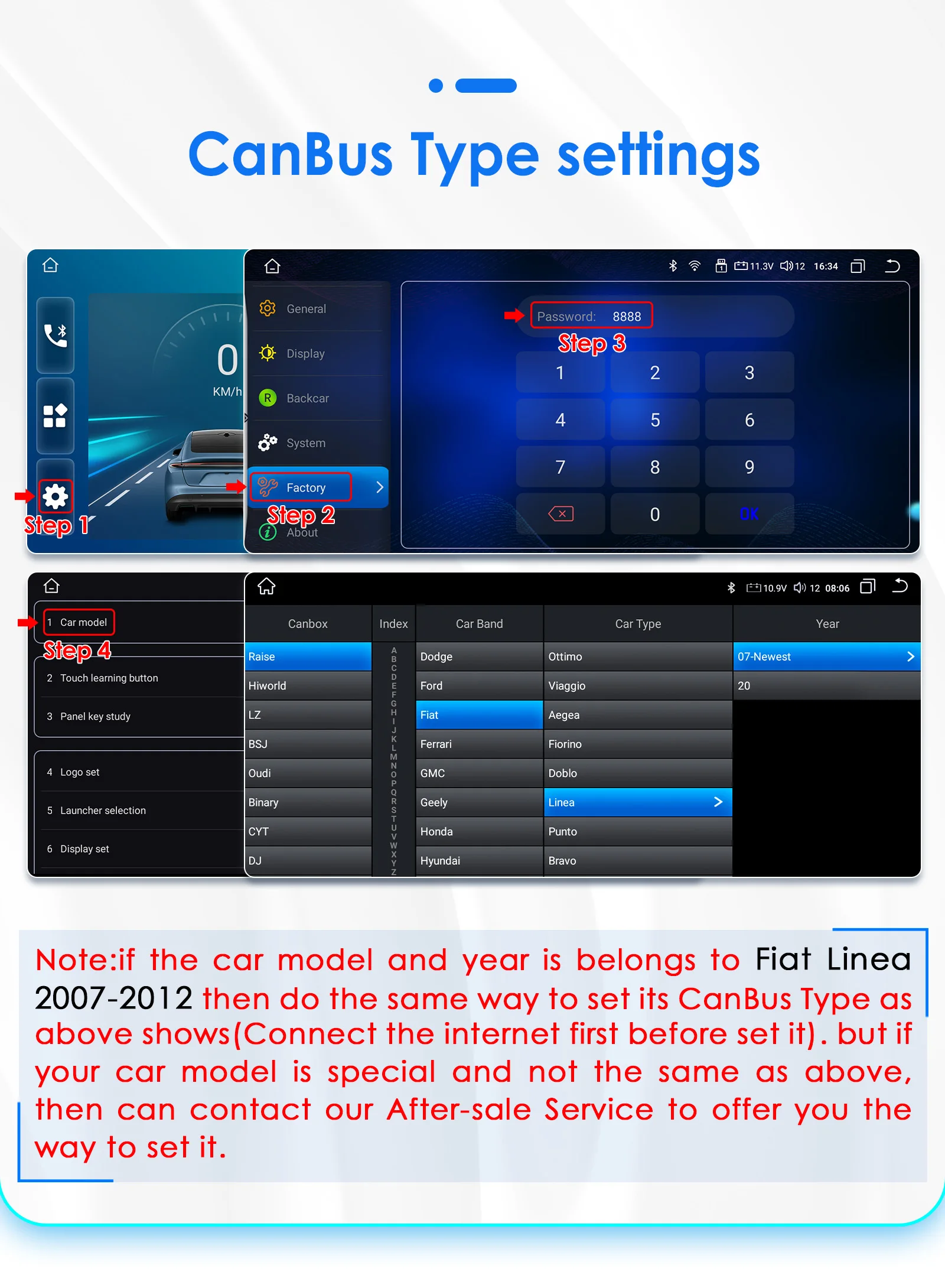 S seires Canbus Type settings: Factory--8888(Password)----Raise--Fiat--Linea--07-Newest--OK.