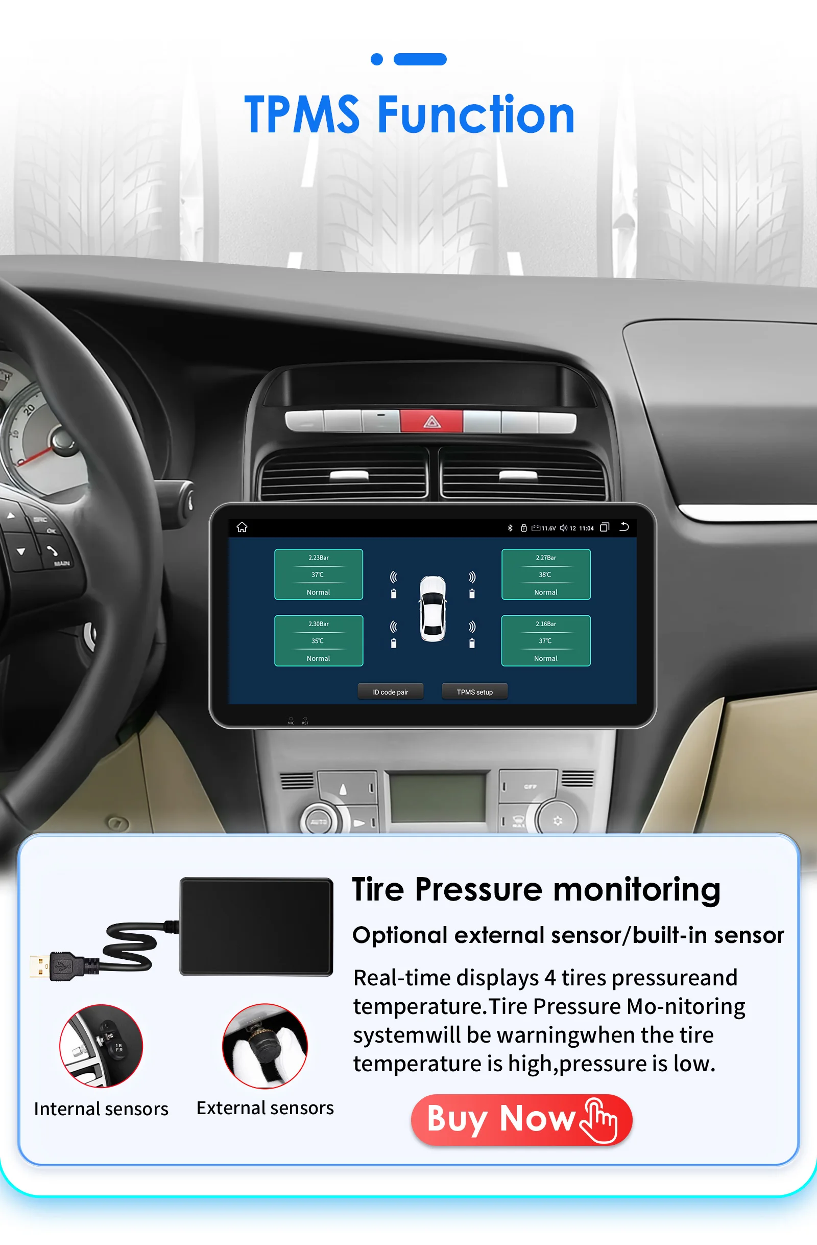 TPMS Function( Needs to order separately) : Tire Pressure Monitoring: Real-time displays 4 tires pressure and temperature,Tire Pressure Monitoring system will be warning when the tire temperature is high, pressure is low.