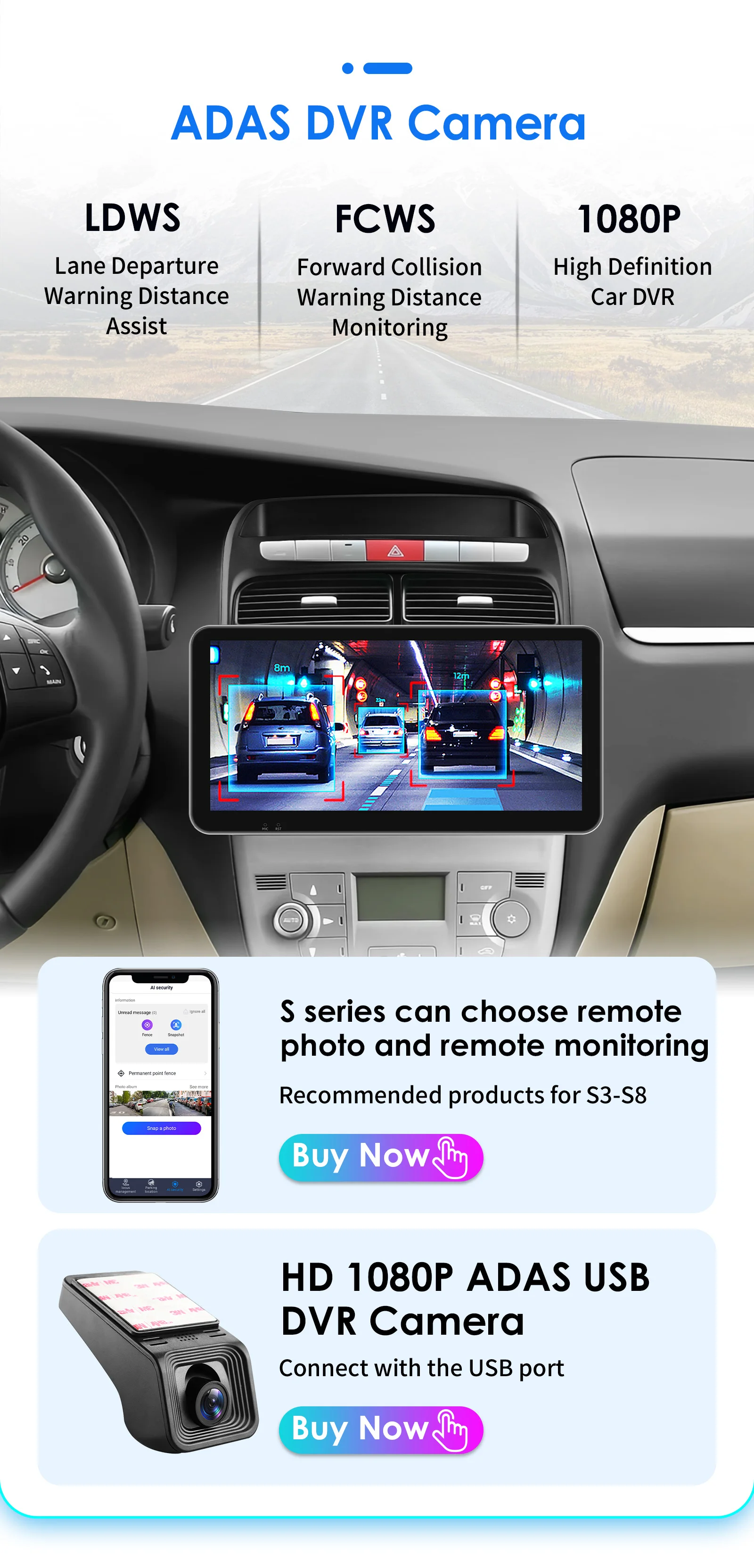 HD 1080P ADAS DVR Camera(Needs to order separately) --connect with the USB port: LDWS(Lane Departure Warning Distance),FCWS(Forward Collision Warning Distance), 1080P(High Definition Car DVR).