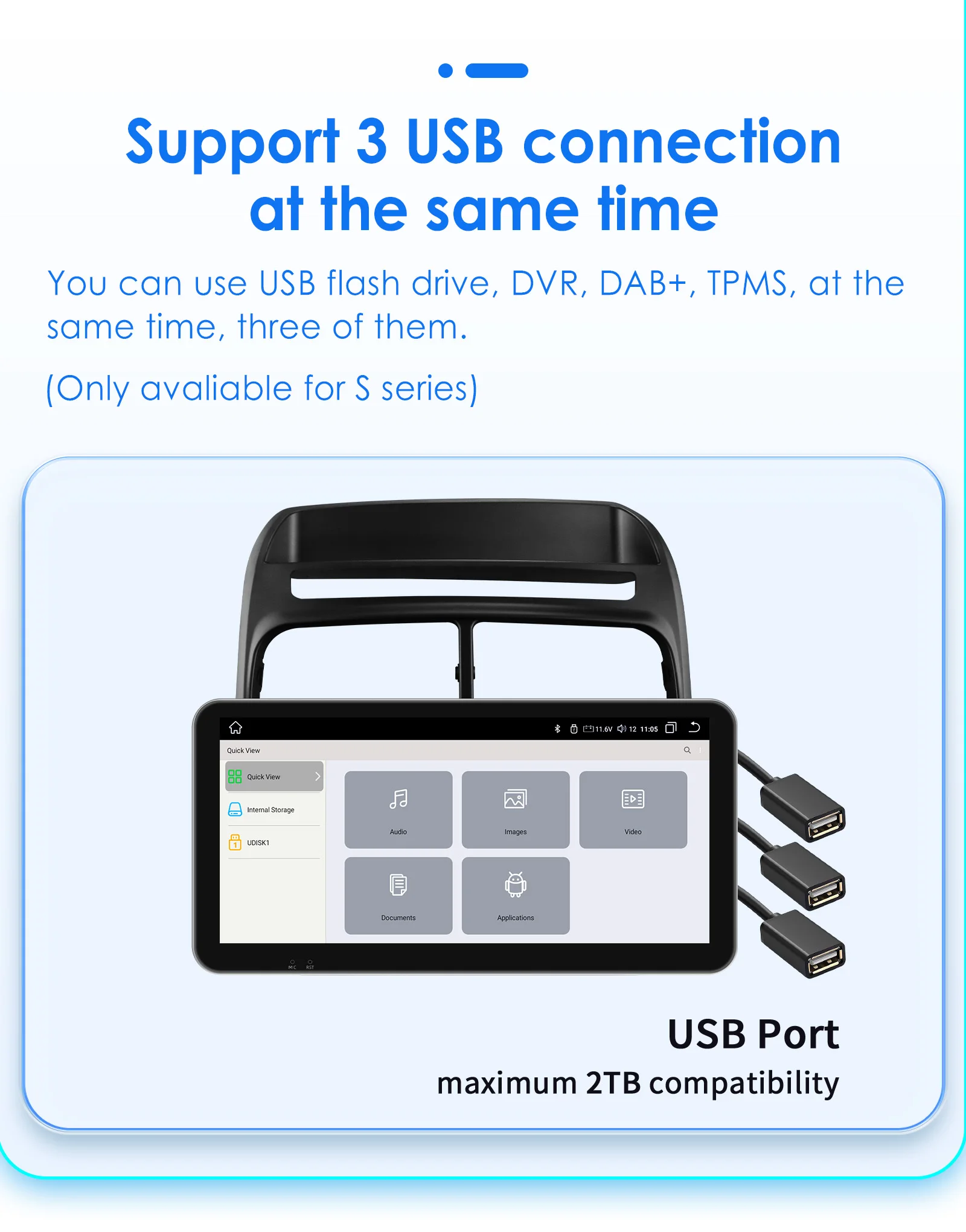 External Memory: USB port up to 2TB,this unit can play the video and audio files from your external device.