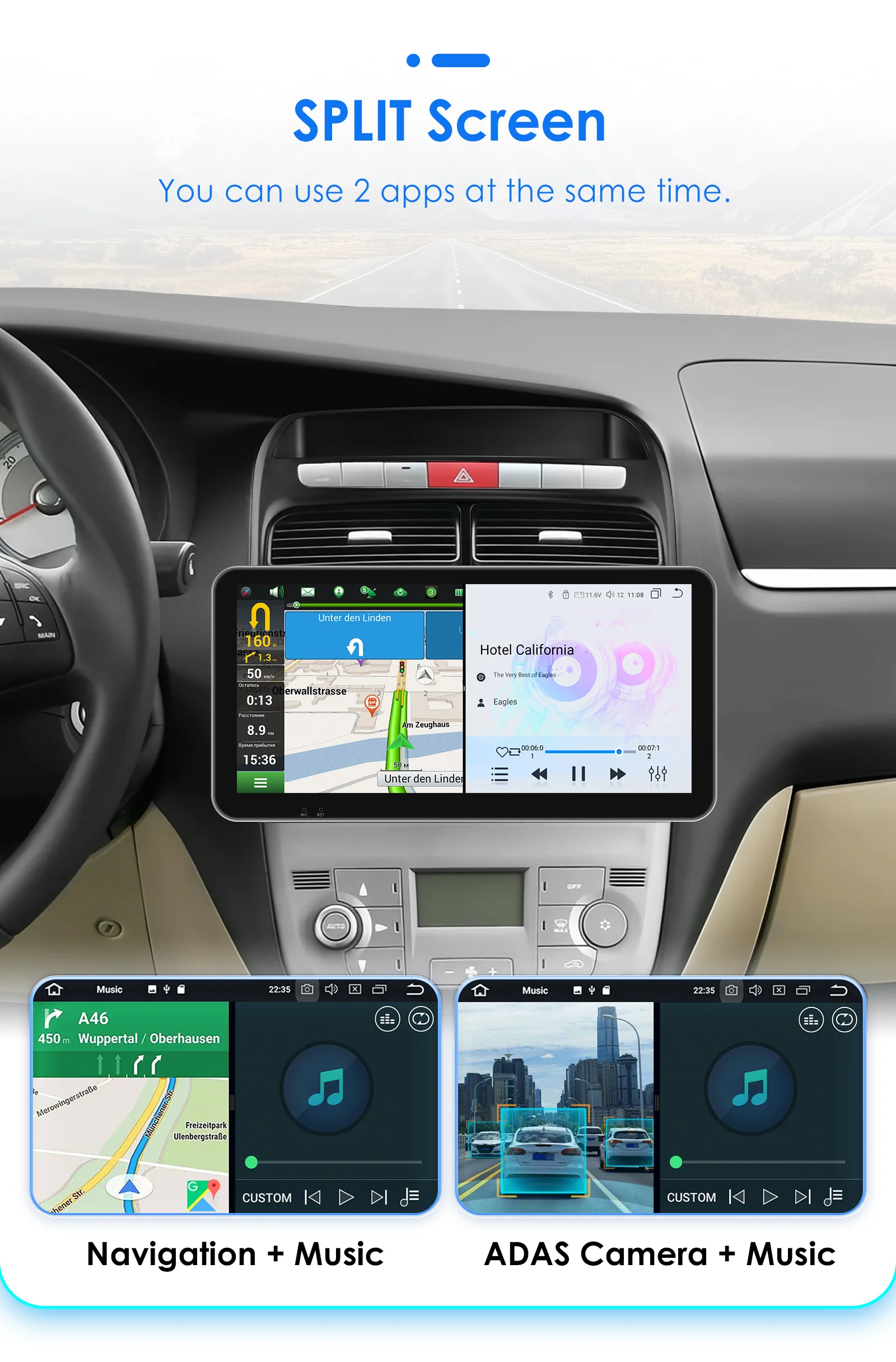 Split Screen : You can use 2 apps at the same time (such as: Navigation + Music , ADAS Camera + Music ,etc.)