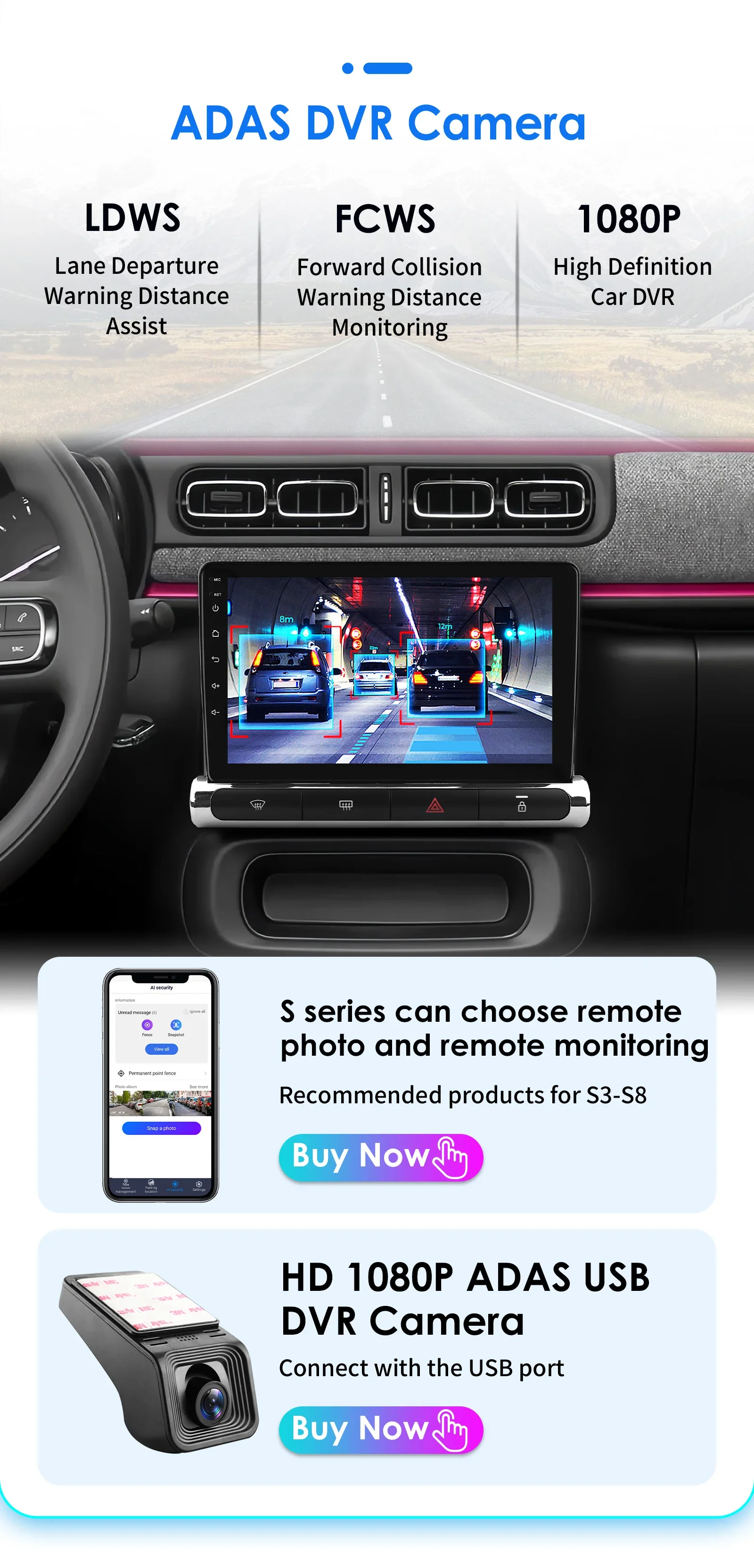 Telecamera DVR ADAS HD 1080P (da ordinare separatamente) -- collega alla porta USB: LDWS (Lane Departure Warning Distance), FCWS (Forward Collision Warning Distance), 1080P (High Definition Car DVR).