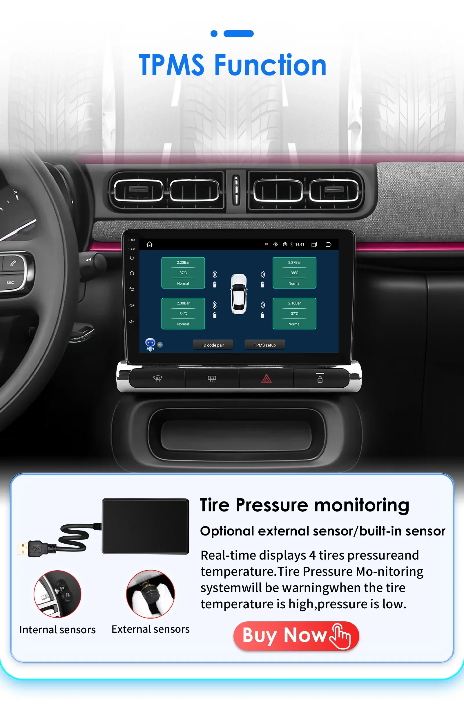 Funzione TPMS (da ordinare separatamente): monitoraggio della pressione dei pneumatici: visualizza in tempo reale la pressione e la temperatura di 4 pneumatici, il sistema di monitoraggio della pressione dei pneumatici avvisa quando la temperatura dei pneumatici è alta o la pressione è bassa.