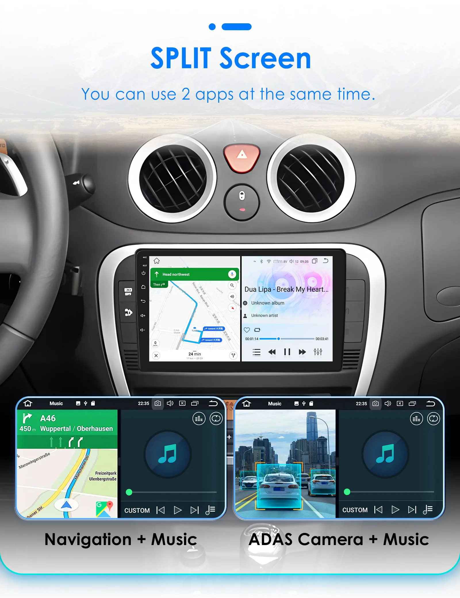 Schermo diviso: puoi usare 2 app contemporaneamente (come: navigazione + musica, telecamera ADAS + musica, ecc.)