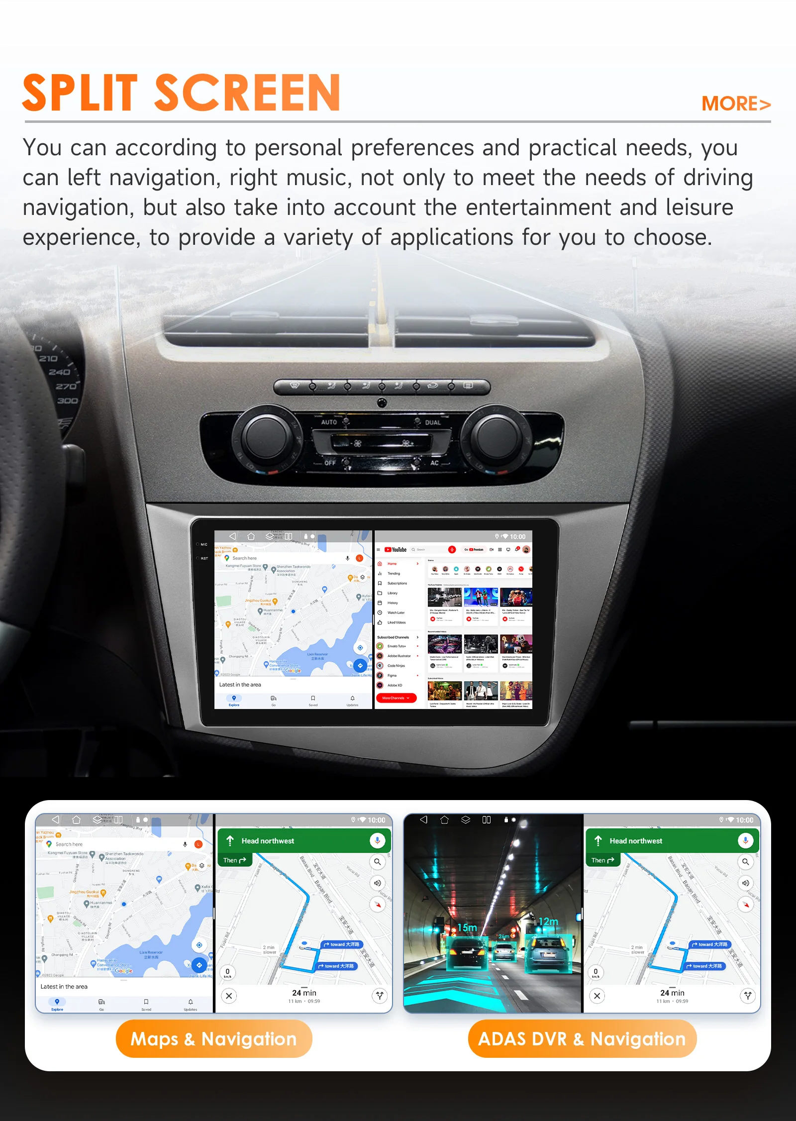 You can according to personal preferences and practical needs,you can left navigation,right music, not only to meet the needs of driving navigation, but also take into account the entertainment and leisure experience, to provide a variety of applications for you to choose.