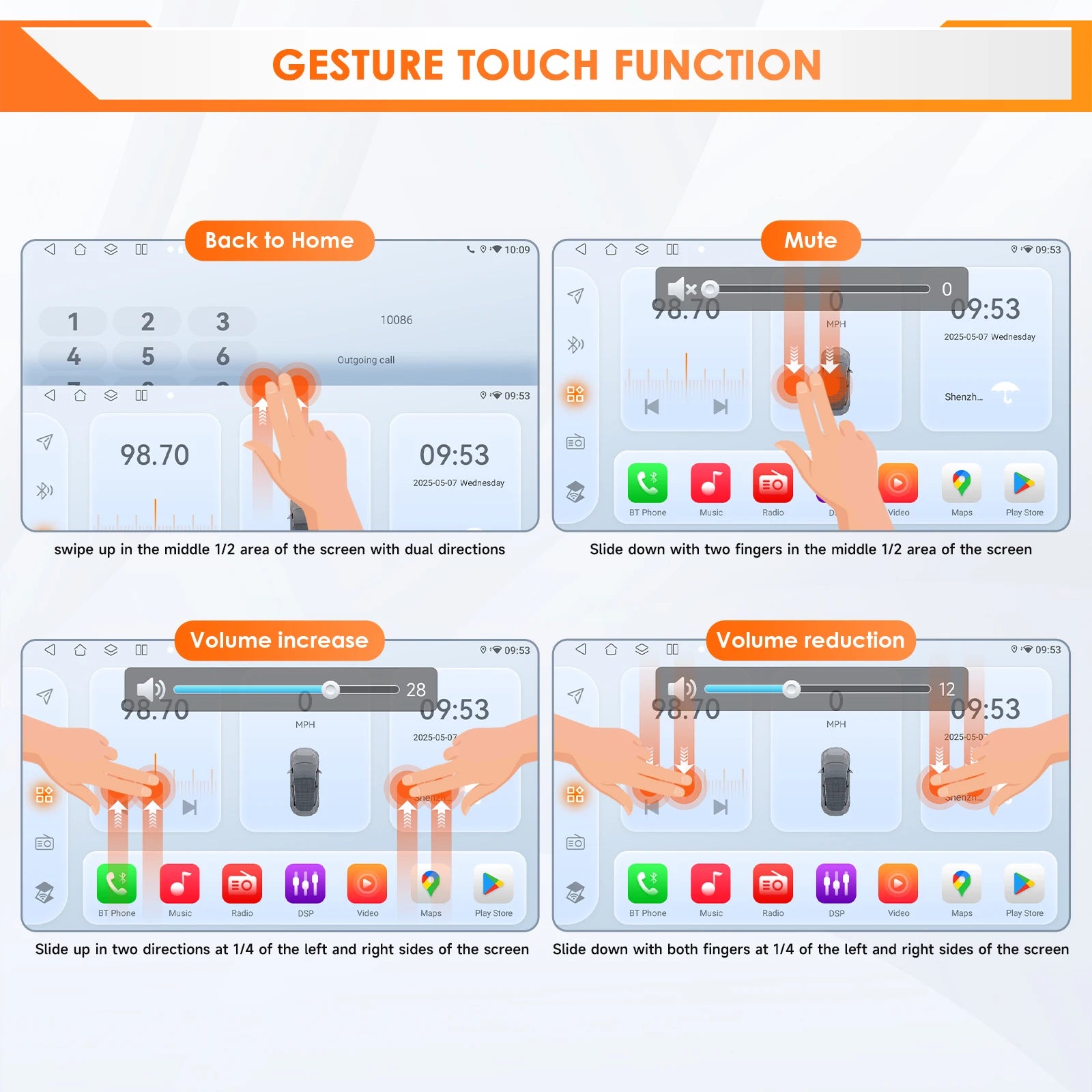 Dopo aver acceso l'interruttore, saranno supportate le seguenti funzioni gestuali. È possibile eseguire operazioni di scelta rapida per tornare al menu principale e alla regolazione del volume.