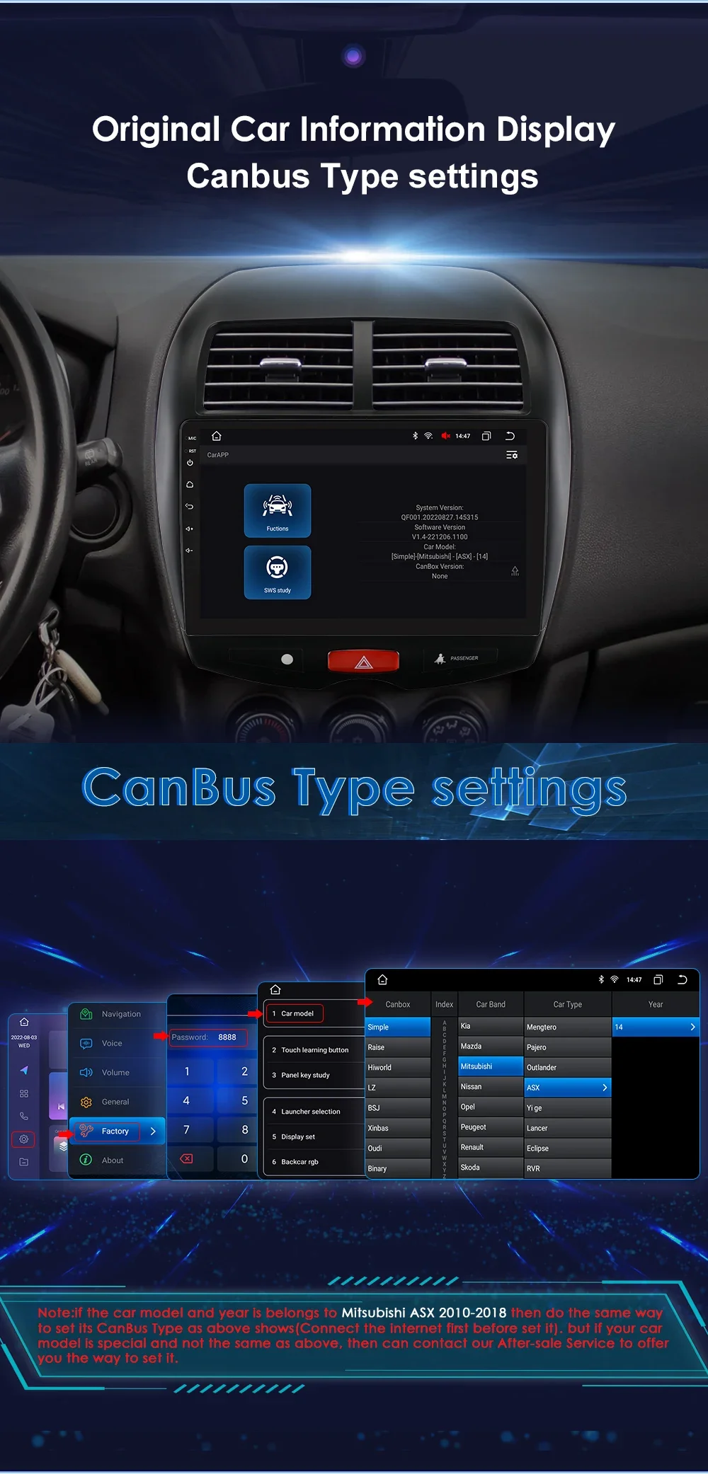 Canbus Type settings: Factory--8888--Car model--Simple--Mitsubishi--ASX--14--ok.