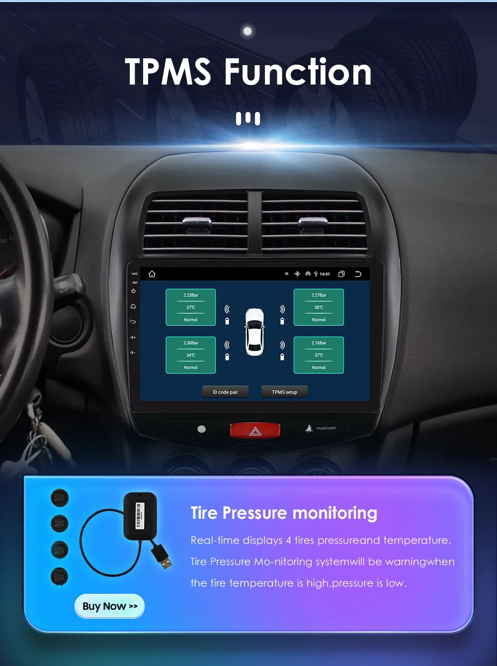 TPMS Function( Needs to order separately) : Tire Pressure Monitoring: Real-time displays 4 tires pressure and temperature,Tire Pressure Monitoring system will be warning when the tire temperature is high, pressure is low. (picture show of manual version item)