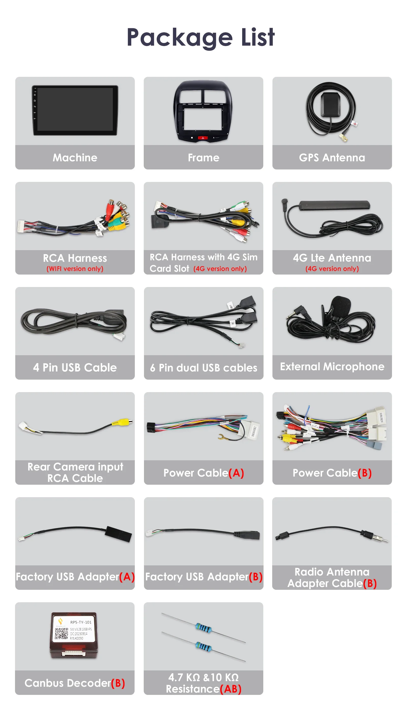 Standard Accessories: which ship with the head unit together(but please pay attension to the red words of accessory whether can get or not which depends on the item option you choose to buy it) (picture show of manual version item)