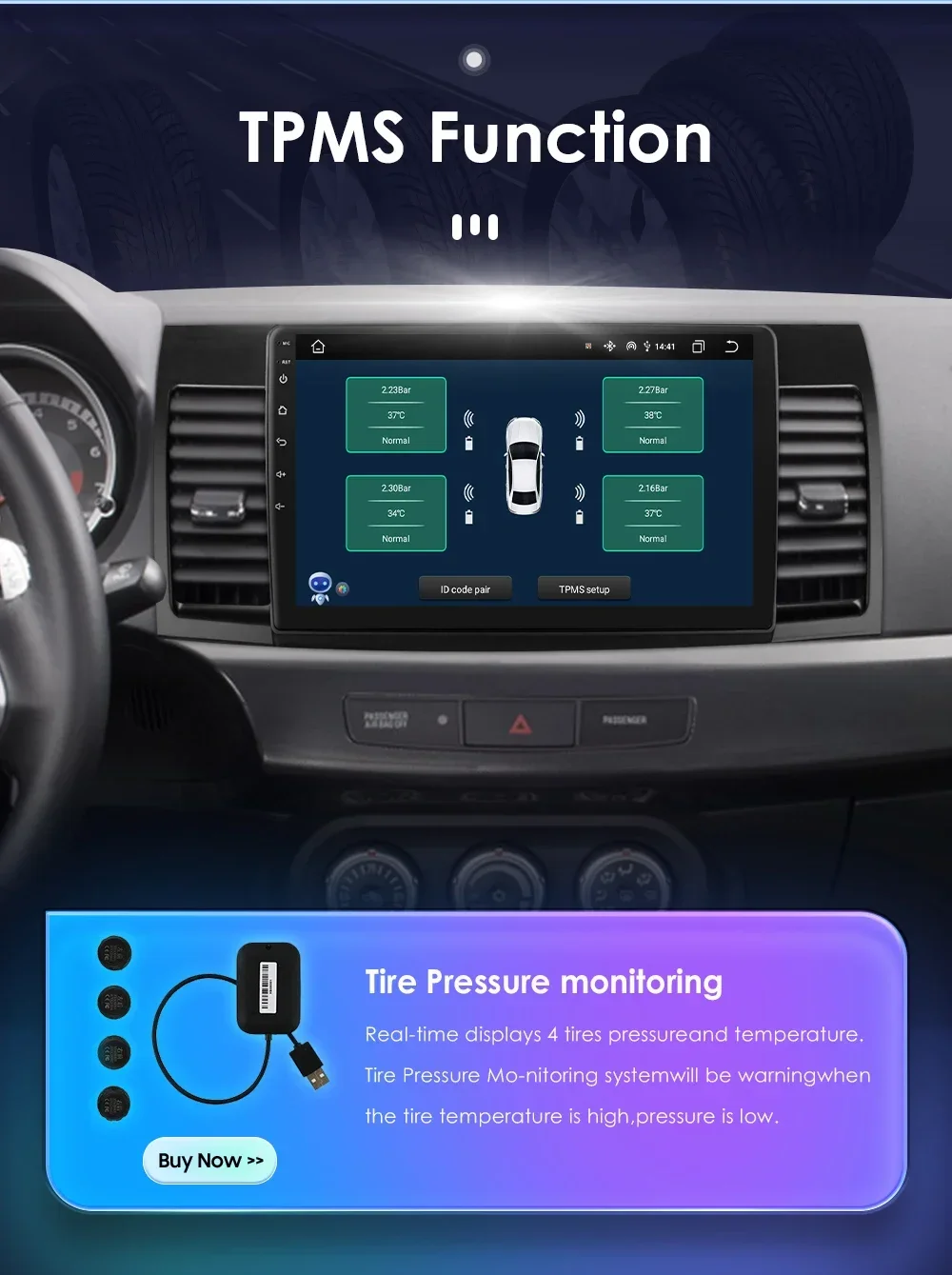 Funzione TPMS (da ordinare separatamente): monitoraggio della pressione dei pneumatici: visualizza in tempo reale la pressione e la temperatura di 4 pneumatici, il sistema di monitoraggio della pressione dei pneumatici avvisa quando la temperatura dei pneumatici è alta o la pressione è bassa.