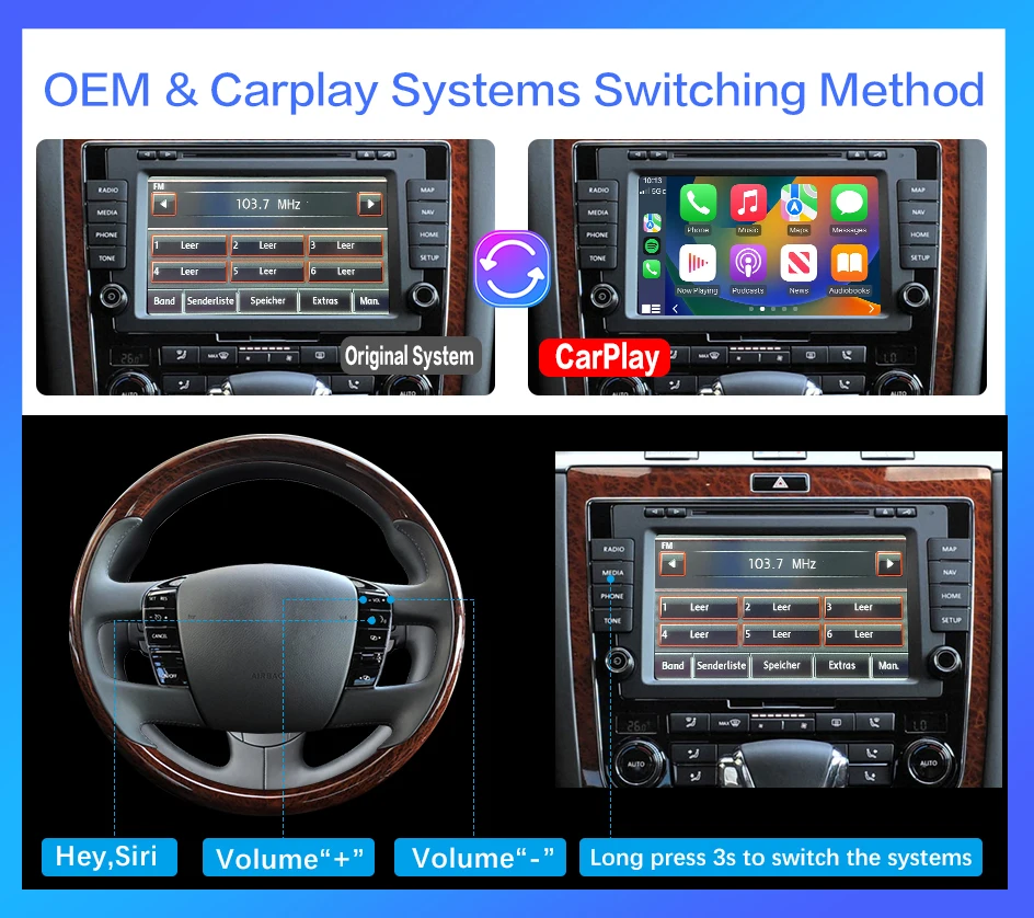 Plug and play del cavo originale dell'auto, nessun filo da tagliare. Non è necessario sostituire lo schermo di fabbrica per rendere la tua auto più intelligente. Questo fantastico kit aggiunge la piena funzionalità CarPlay al tuo sistema esistente mantenendo tutte le funzionalità del sistema originale. Il sistema CarPlay supporta il controllo tramite pulsanti e volante ed è integrato con la console o il vano portaoggetti USB.