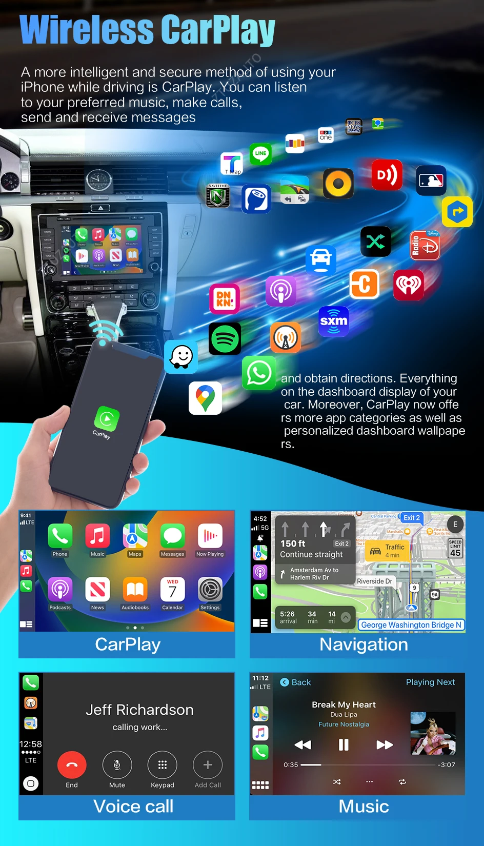 Sia che il tuo sistema sia dotato di navigazione, modulo telefono o Bluetooth, che si tratti di Mappe Apple, Spotify, di effettuare/ricevere chiamate o di utilizzare Siri per rispondere a messaggi, il sistema supporta pienamente i sistemi Apple e le funzionalità del telefono